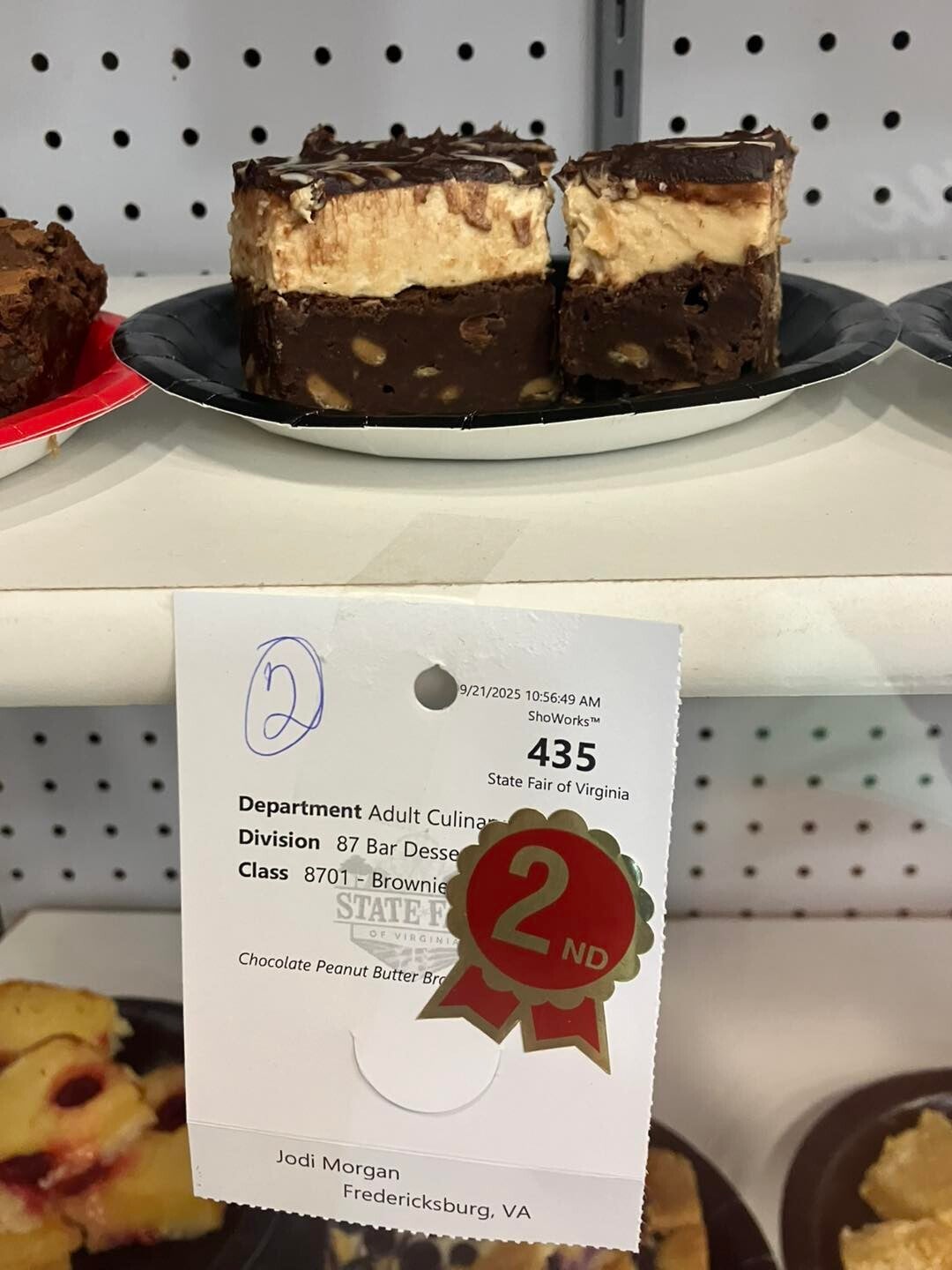 After several years of baking for fun and family I started entering my creations in the county and state fairs. I was honored to win "Greatest State Fair Pie" for my turtle cheesecake in 2022 and "Greatest State Fair Cake" for my snickers cake in 2023. I have also won numerous other ribbons at both the Fredericksburg Fair and the Virginia State Fair over the last 5 years.